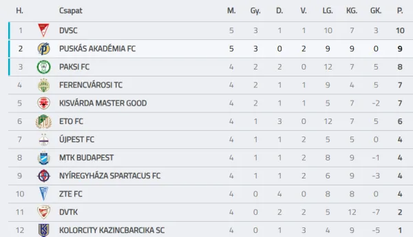 A DVSC így öt forduló után veretlenül vezeti a bajnokságot, a Puskás Akadémia pedig első hazai vereségét szenvedte el a szezonban.