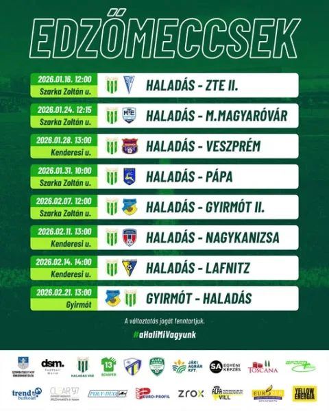 A nemzetközi kitekintés sem marad el: február 14-én az osztrák Lafnitz lesz a Haladás vendége a Kenderesi úton. A felkészülési időszak utolsó mérkőzését február 21-én játssza a csapat, amikor Gyirmóton lép pályára.