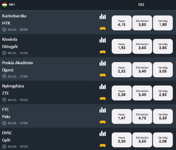 Az NB I következő fordulója több izgalmas párosítást is tartogat, és az oddsok alapján most is akad néhány kifejezetten játszható tipp. Van favorit, van rangadó, és van olyan meccs is, ahol a szorzó miatt már komolyabb érték rejlik. Összeszedtünk egy ötmeccses ajánlatot, amelyből akár egy erősebb hétvégi szelvény is összerakható.